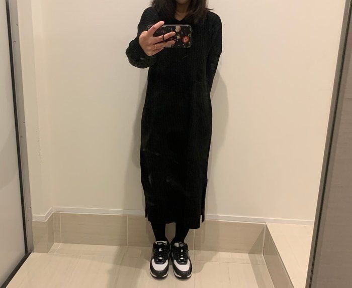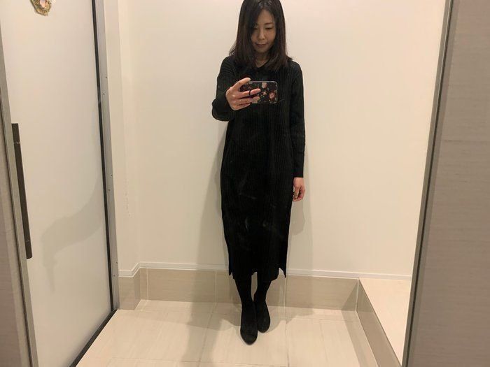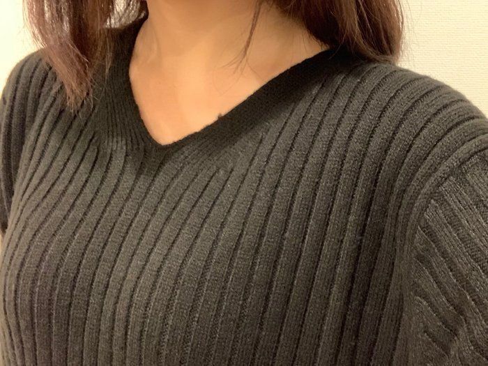 リブワンピなので身体にソフトにフィットし、くびれを強調してくれます。丈感も短すぎず長過ぎずちょうどよし(身長162cmでMサイズを購入しました)。首元はVネックで顔まわりはすっきりします。