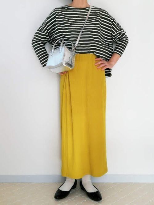 スカートをイエローにチェンジ!ぱっと明るい印象になり、コーデがぐっとあか抜けて◎。