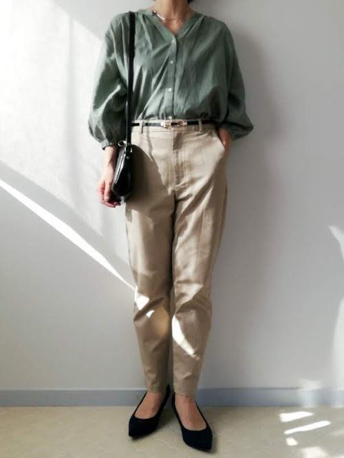 ベージュのテーパードパンツを合わせて、きちんと感ある着こなしに。