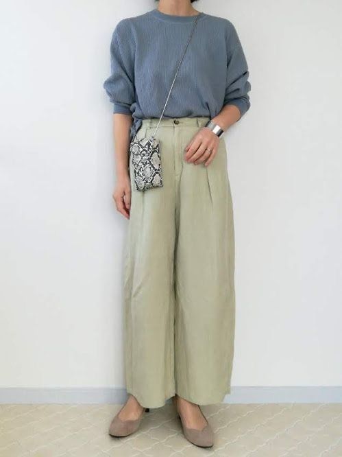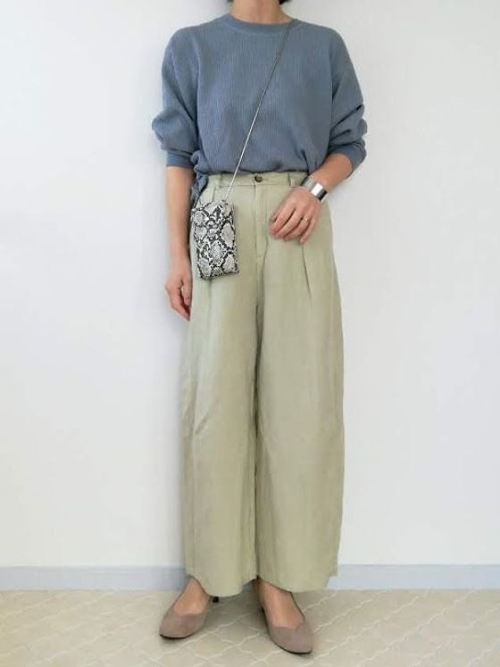 トレンドのミントカラーのワイドパンツで、爽やか大人カジュアルコーデ。ベージュのパンプスで、全身をまとまりあるワントーンコーデに。ぼんやり見えないように、パイソン柄ミニショルダーとシルバーバングルで辛口アイテムをプラス!