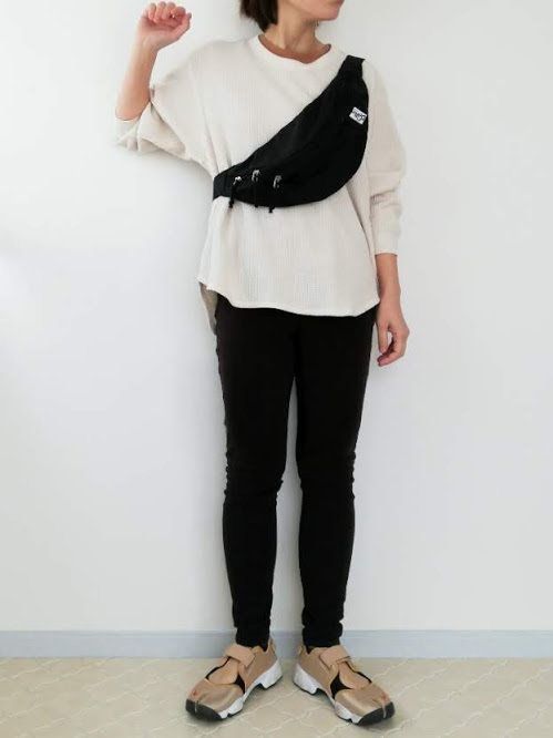 後ろが長いデザインなので、1枚で着てもお尻が隠れるのがうれしいポイント。スキニーパンツに合わせても安心です。黒スキニー×スニーカーのスポーツMIXコーデは、アクティブママコーデにもおすすめ!ボディバッグをななめがけして、シンプルコーデのアクセントに。