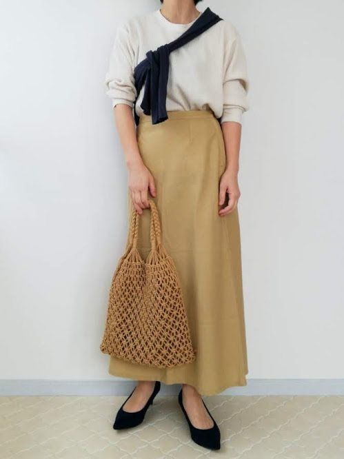 ロング丈のチノスカートに合わせてきれいめナチュラルな着こなしに。ほっこりコーデはもさっとした印象になりがち。パンプスできれいめ要素をプラスして、ナチュラルコーデを大人らしくアップデート。