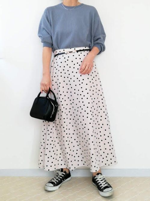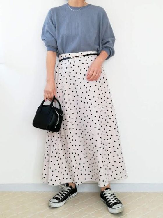 ドット柄ロングスカートで大人かわいいカジュアルコーデ。「ブルー」のワッフルTと黒のバッグ&スニーカーでドットスカートの甘さをほどよく抑えた着こなし。シルバーネックレスとナローベルトで、大人らしさをプラス!
