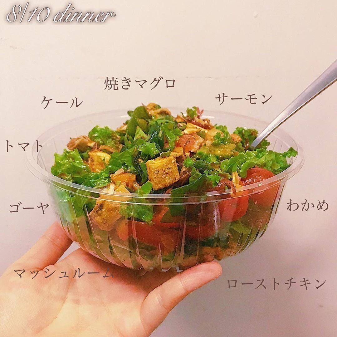 この日の夕食は、ケール・トマト・ゴーヤ・マッシュルームのサラダに、焼きマグロ・サーモン・ローストチキン・ワカメをトッピングをして食べました。また、食事をするときにはスマートフォンなどの電子機器をいじらずに、30分程度かけてゆっくりと食べることを意識。そう心がけることで、以前よりも食事の満足度がアップしたそうです。