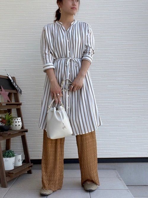 ホワイト×ベージュブラウンの組み合わせで、定番ストライプをアップデート。共布でウエストマークできるので、さりげなく脚長効果もプラスできます。