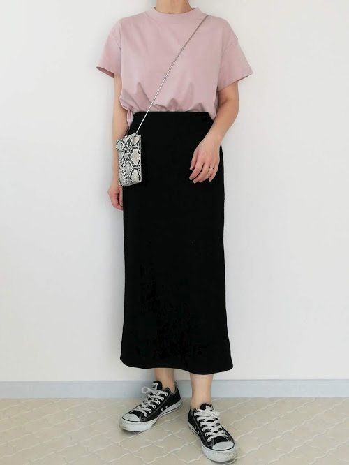 ピンク×スカートコーデをカジュアルダウンするなら「黒タイトスカート」がおすすめ!