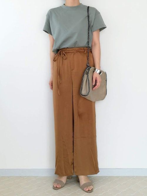サテン生地のパンツなら、地味見えを防ぎ今っぽいコーデになって◎。