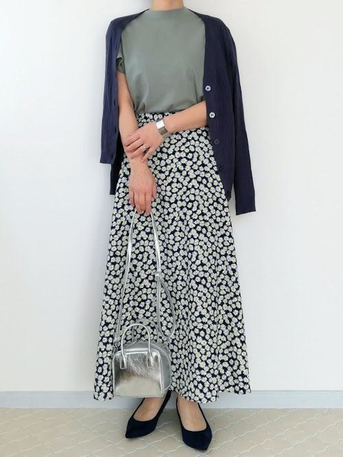 グリーン×ネイビーベースの花柄スカートできれいめな着こなしに。