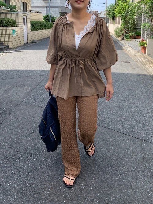 ふんわりとした袖が特徴的なブラウスは、ウエストをしぼって女性らしいシルエットに。胸元のボタンをあけてインナーのレースを見せるのがポイントです。素材で遊んだワンカラーコーデ。