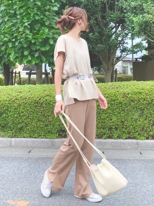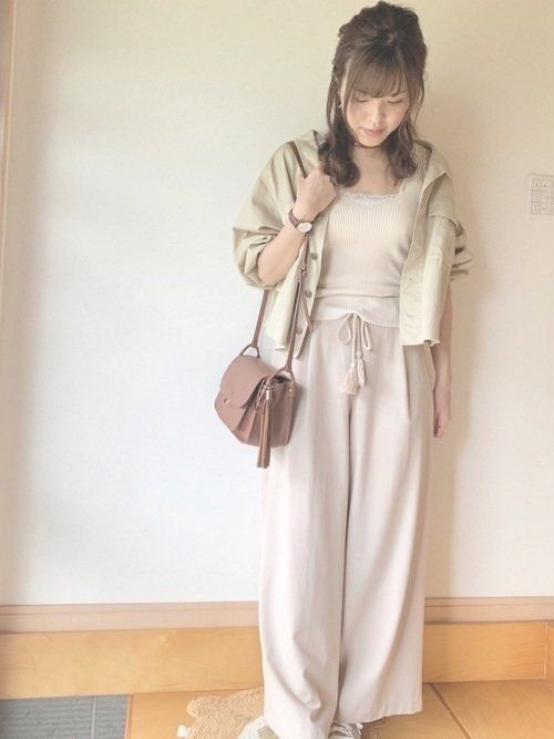 全身を淡いベージュで統一した、ガーリーカジュアルコーデ。ゆるく巻いたヘアスタイルがお似合いです。ブラウンの時計とバッグをセレクトすることでメリハリが出ています。