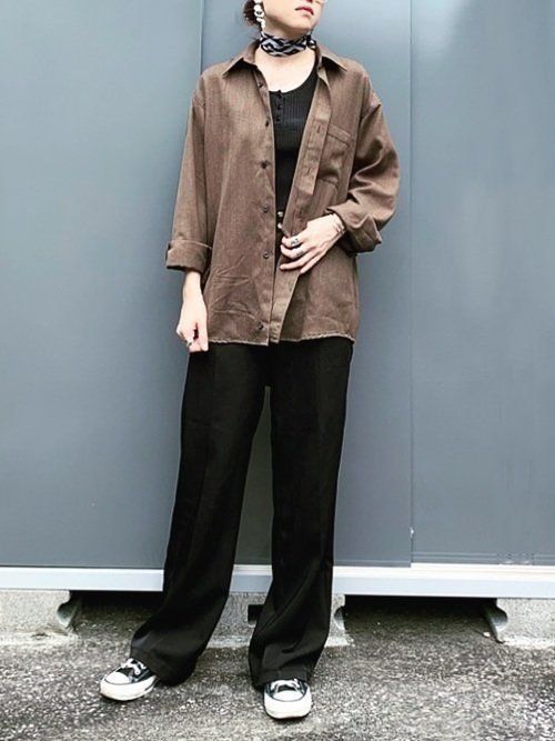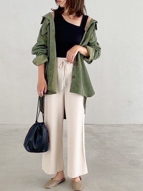 ミリタリー感がかわいいゆったりサイズのシャツは、肩をおとしてこなれた雰囲気で着こなすのがおすすめ。アシメタンクトップがアクセントになり、リラクシーなコーデの完成です。