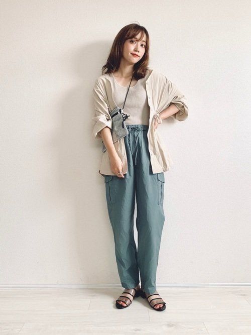やさしいカラーリングがポイントのコーディネート。類似色のタンクトップとブラウスでアンサンブルのように着こなしています。インナーはボトムスにしまってすっきりと。ブラウスは税込1,500円。