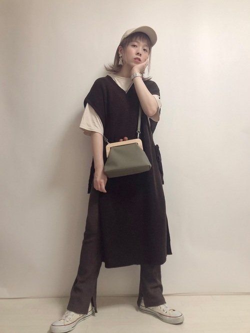濃色カラーのVネックが、首元をきれいに見せるロングベスト。インナーに着た白Tがこなれ感を演出しています。大ぶりイヤリングやがま口バッグなど、小物のセレクトも秀逸です。