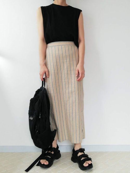 Iラインシルエット&ストライプで、下半身の細見え効果ばつぐん。ロング丈が大人っぽく、”いい女”っぽさを演出してくれます。サイドスリットのおかげで、足さばきも楽なのがうれしい!