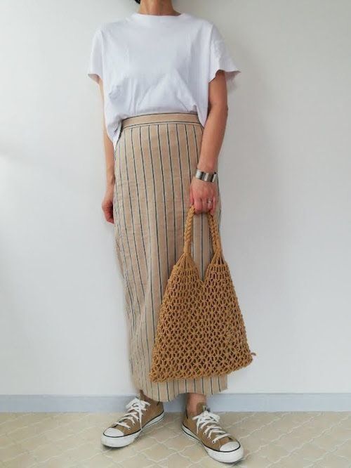 シンプルな白Tは、ナロースカートに合わせるとクリーンで大人っぽい印象に。