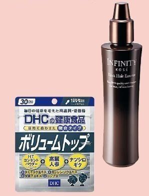 (右)「インフィニティ 黒髪育毛エッセンス」〈医薬部外品〉(150ml)¥5,000(編集部調べ)/コーセー (左)14種類の豊富な成分で黒々をめざす。「ボリュームトップ 30日分」¥3,048/DHC