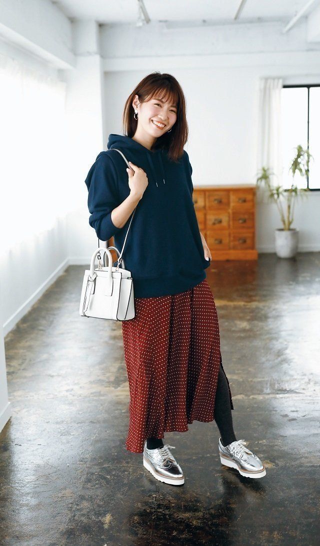 フェミニン派:定番柄スカートはフーディで!スポーティ要素をたすと旬顔に