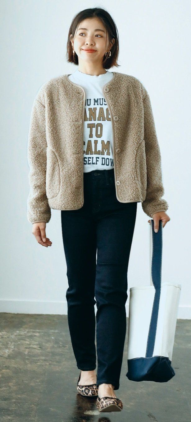 フリースボアブルゾン¥2,990、アンクルスキニーデニム¥3,990/UNIQLO ロゴTシャツ¥7,800/BYMITY イヤリング¥2,400/アネモネ(サンポークリエイト) バッグ¥5,900/L.L.Bean バレエシューズ¥5,400/ILIMA(LOCONDO)
