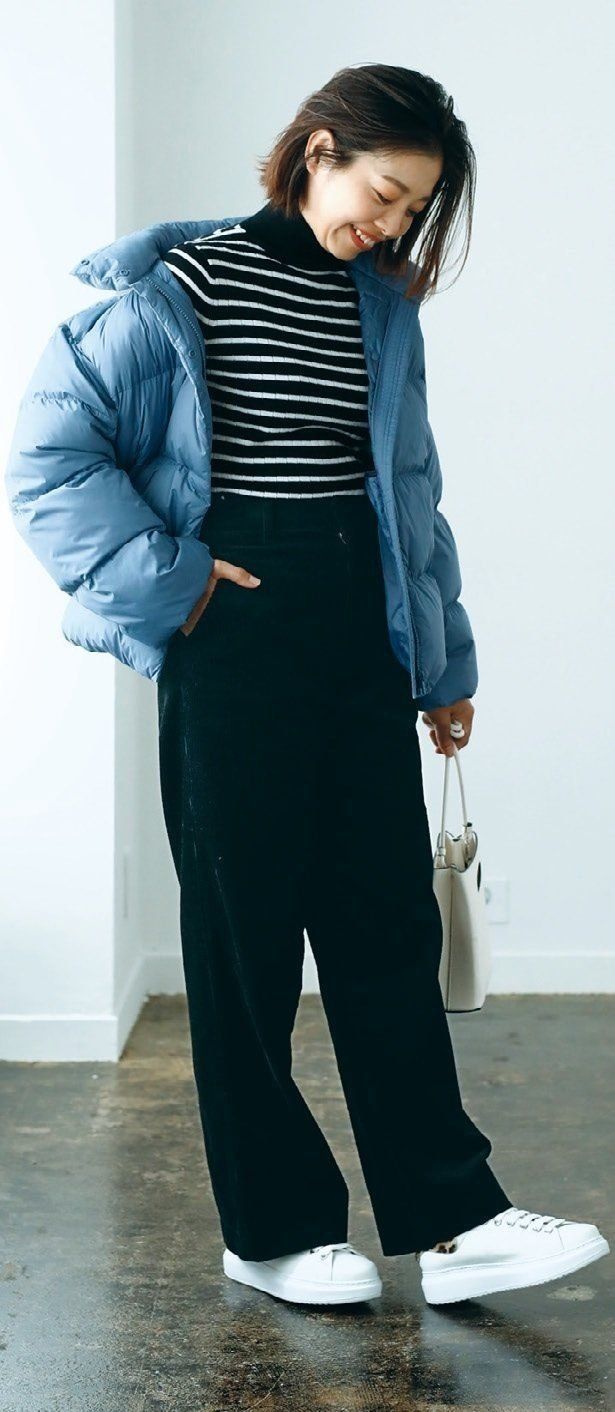 ウルトラライトダウンジャケット¥6,990、コーデュロイワイドパンツ¥2,990/UNIQLO ボーダーニット¥9,900/ランズエンド(ランズエンド ジャパン) バッグ¥3,990/MANGO(LOCONDO) スニーカー¥26,000/コルソ ローマノーヴェ(ゼア ニュウマン新宿)