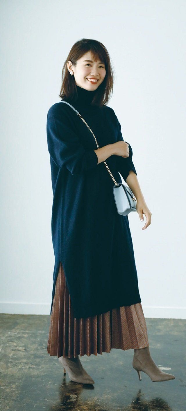 ハイネックスリットワンピース¥3,990/UNIQLO 光沢プリーツスカート¥10,900、バッグ¥2,990/MANGO(LOCONDO) パールイヤリング¥1,500/アネモネ(サンポークリエイト) ブーツ¥32,000/ファビオ ルスコーニ(ゼア ニュウマン新宿)