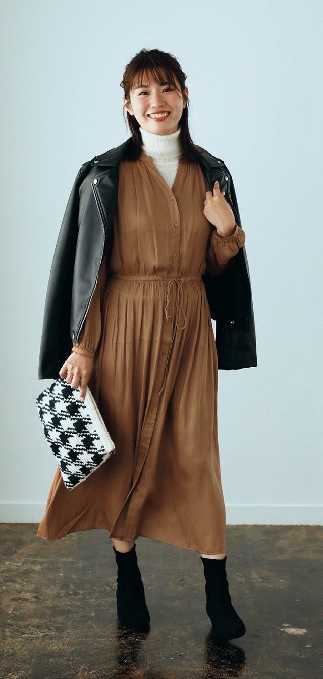 ドローストリングシャツワンピース¥3,990、リブタートルニット¥2,990/UNIQLO ライダースジャケット¥7,990/MANGO(LOCONDO) クラッチバッグ¥27,600/ビヨンドザリーフ(ビヨンドザリーフ アトリエ) ブーツ¥26,000/ファビオ ルスコーニ(ゼア ニュウマン新宿)