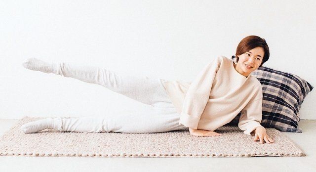 「お尻の横から後ろにかけての筋肉(中殿筋)を鍛えると、メリハリがでて美尻効果が絶大」。足をそろえて横向きになり、ひじをついて上体を起こす。わき腹に力を入れて姿勢を保ち、上の足を30度ゆっくり上げて下ろす。左右5回行う。