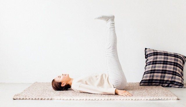 あおむけに寝て、足をそろえて床と垂直に上げ、ひざを真っすぐ伸ばす。つま先をひざに向けるように手前に倒し、つま先が天井を向くように伸ばす。5回繰り返す。「血液やリンパ液を上半身に押し戻すことで、下半身のむくみが解消されます」