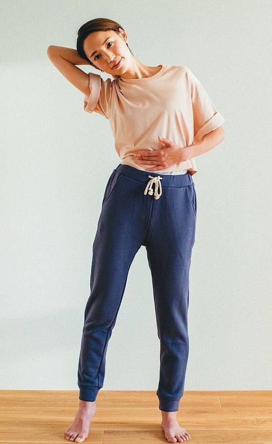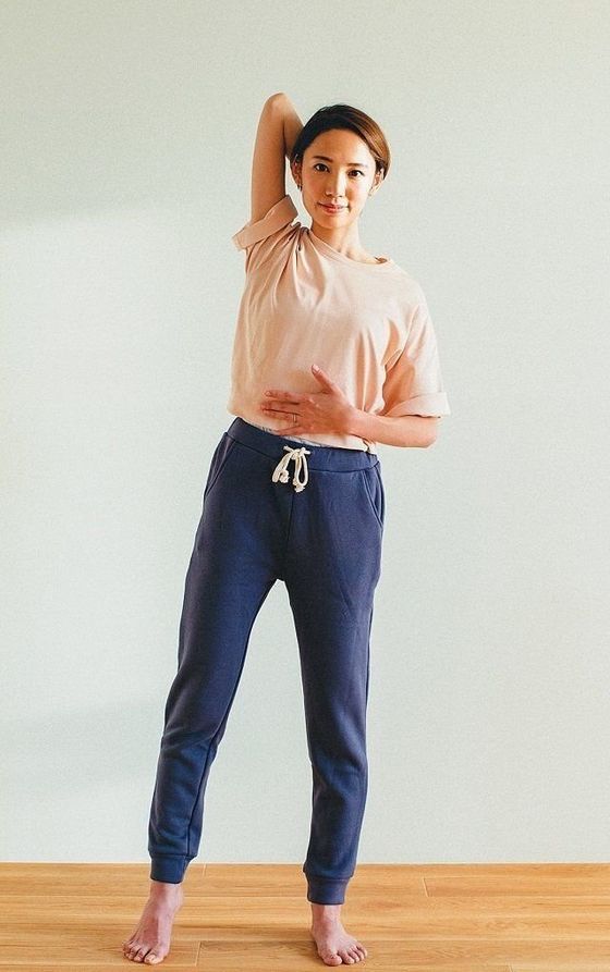 背すじを伸ばしたまま、右足とおなかに力を入れて上体を右に倒していく。倒したら息を止め、5秒数える。息を吸いながら上体を戻す。左右を各10回、1日2セット。