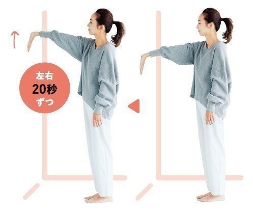壁の前に立ち、指先を下にして手のひらを壁につけ、少しずつ上へ動かし、限界の所で20秒キープ。少しずつ元の位置に戻し、反対側の腕を換えて、同様に行う。