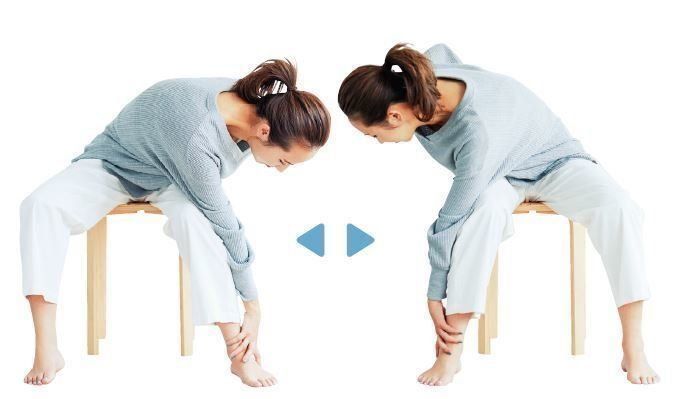 足を開いていすに座り、息を吐きながら、片手で反対側のすねに沿って足首の外側をつかむ。左右交互に10回行う。