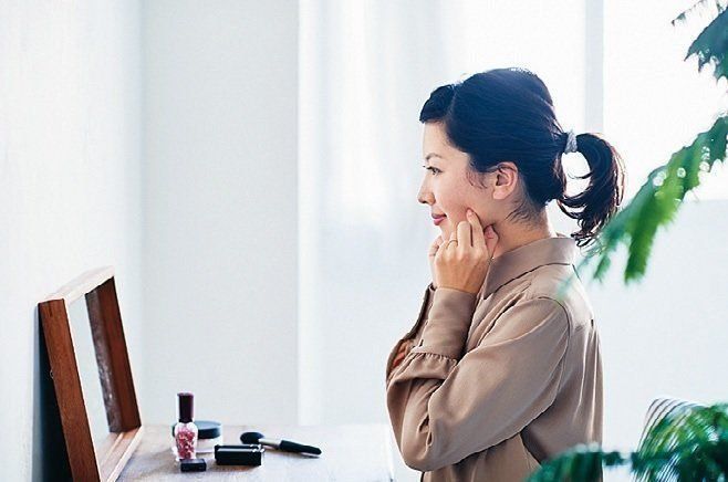 化粧時にフェイスラインとチークラインのマッサージを。肌をこするのではなく、筋肉を伸ばすイメージで刺激します。「二重顎になりがちなのが気になって、動画サイトを参考にしてやり始めました」。