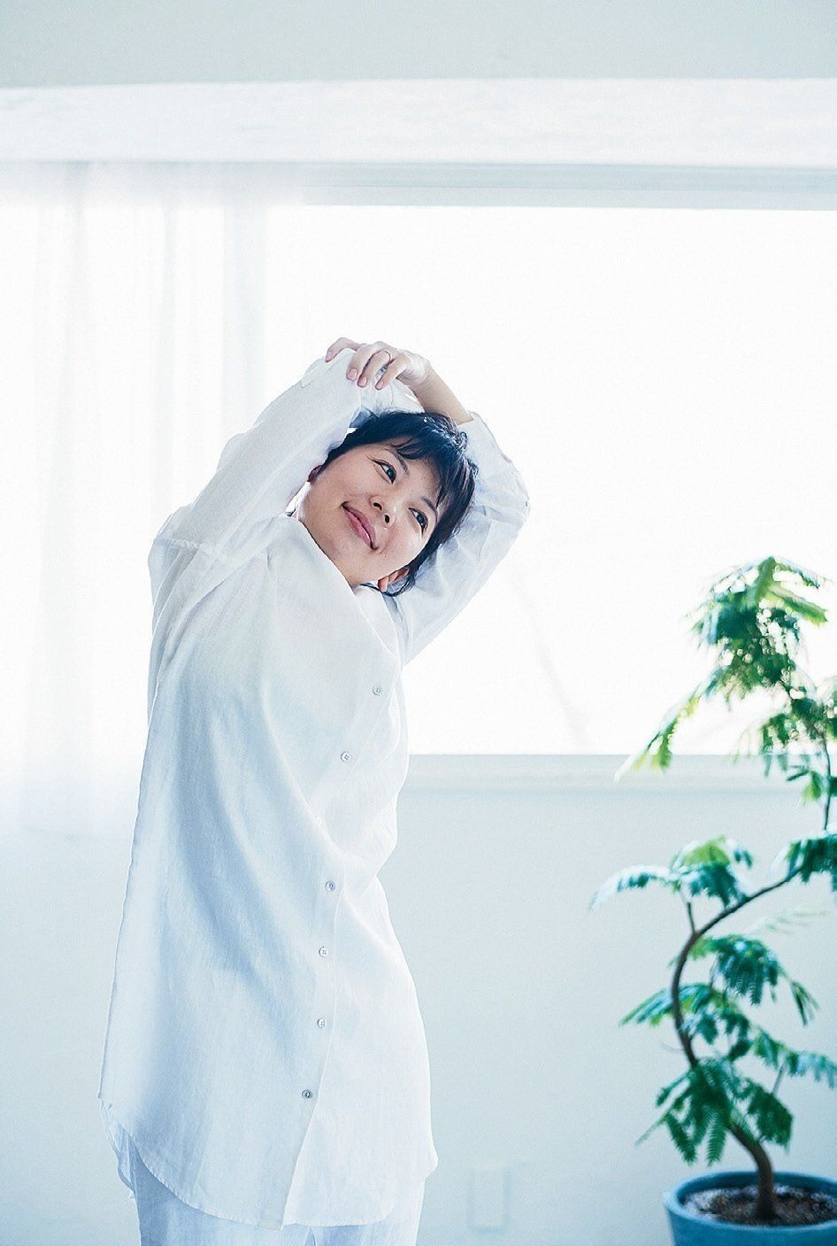 寝起きはふとんの中で大きく伸びをして、体を目覚めさせます。「布団から出たら、わき腹を伸ばすストレッチをしながらキッチンに移動し、歯磨きをしてから白湯を飲むのが日課」。