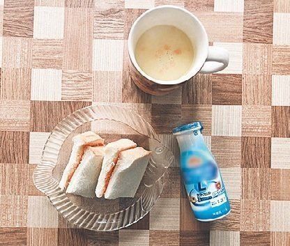 平日の朝は、夫と子ども優先で自分の食事は後回し。「子どもたちのべんとうの残り物を適当につまみつつ、食パン、インスタントのスープなどを立ったまま急いでとるのが日常です」。