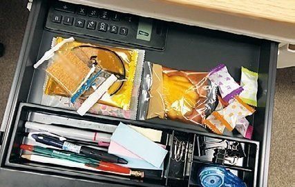 「『1つどうぞ』と回ってくる同僚や上司からのおやつは断れない。もらうばかりじゃ悪いから、自分でも買っておすそわけを」。おやつは机の引き出しに常にキープ。