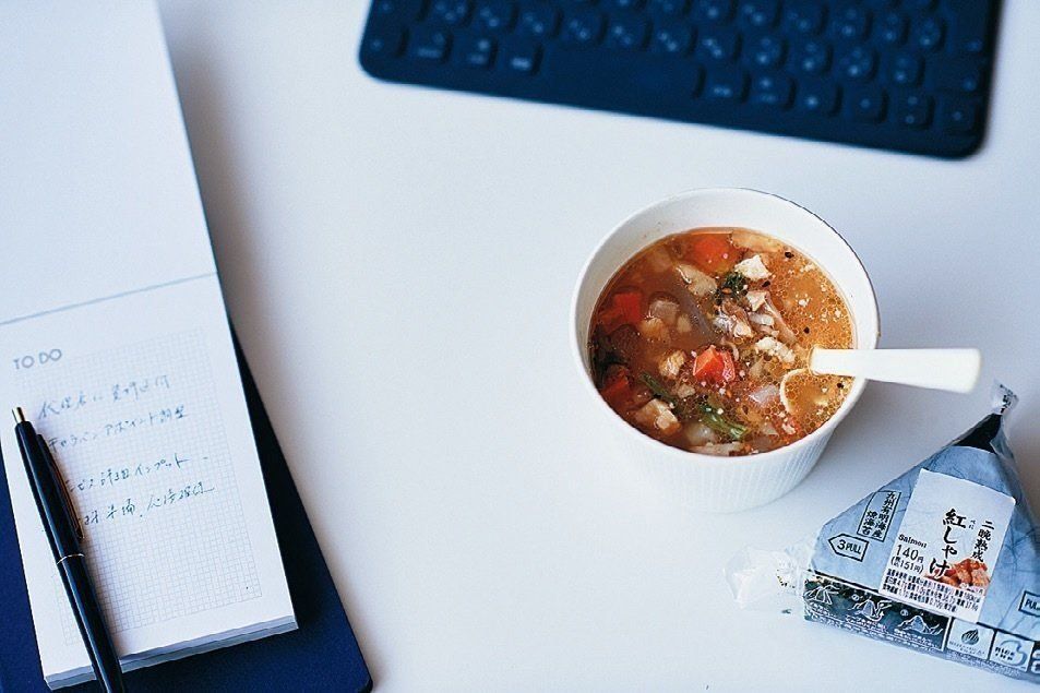 忙しいときは、コンビニで調達。「サッと食べられて、野菜とたんぱく質がいちどにとれるスープは必ず。もの足りないときは、おでんやサラダ、ゆで卵を追加することもあります」。