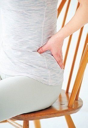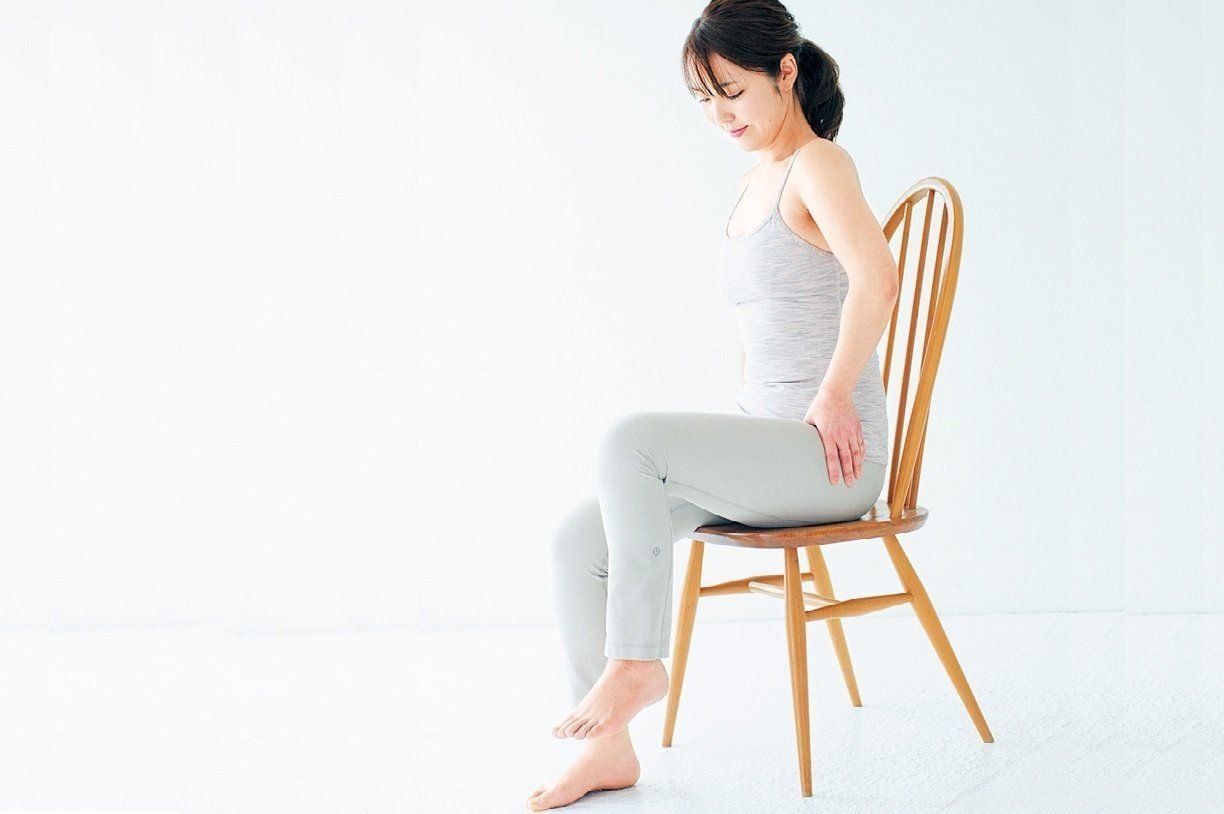 いすに浅く腰かけ、両手の親指を前にして腰骨の上に当て、4本の指を腰骨の後ろのほうに当てる。