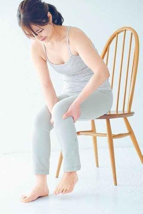 両手を左のひざの上に置き、ひざから脚のつけ根に向かって、ももの前側を5回さする。反対側も同様に。