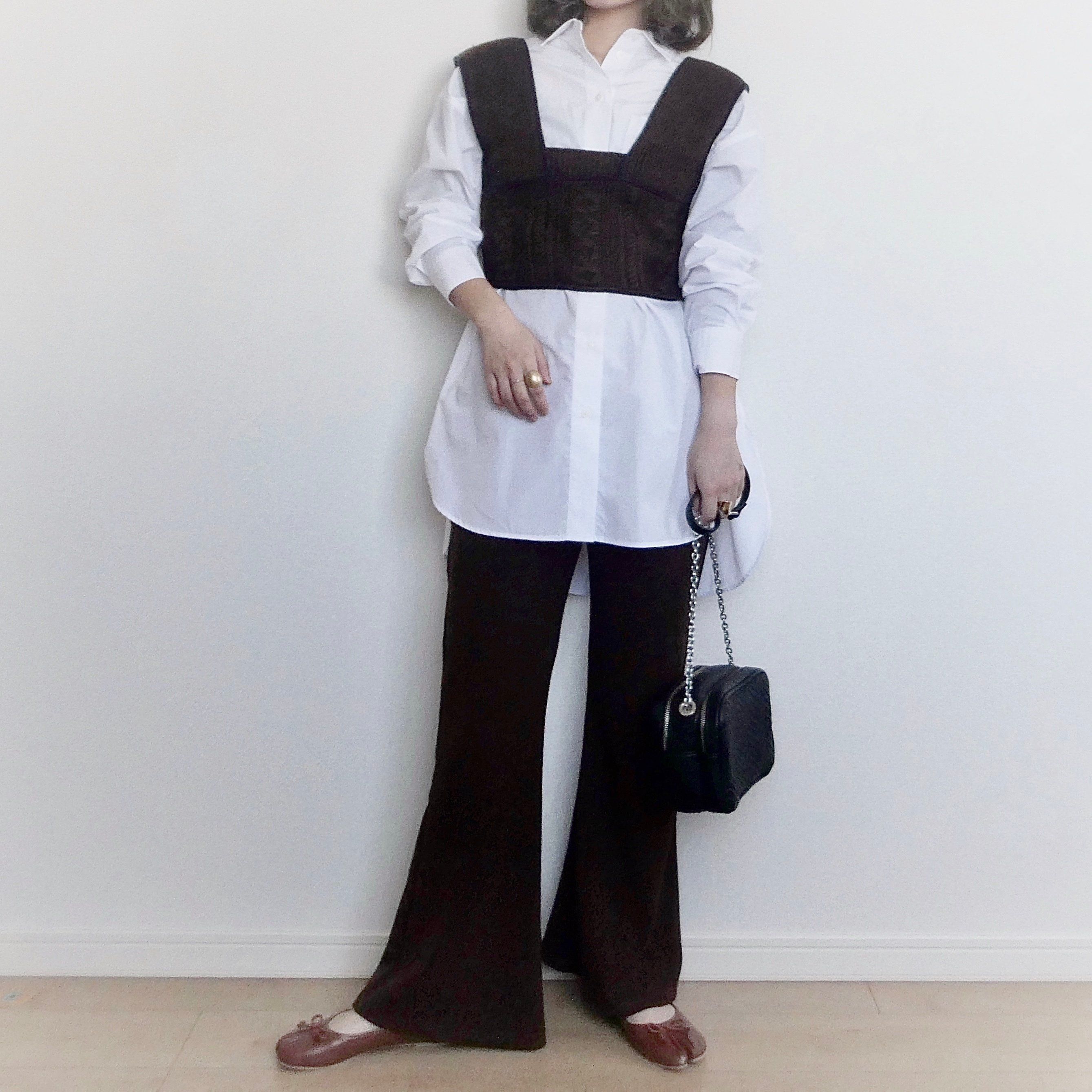 トレンドのニットビスチェと合わせればトレンドコーデの完成です。
