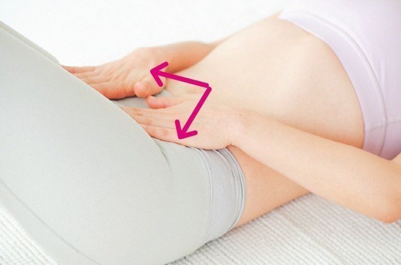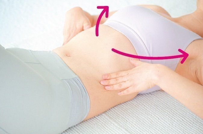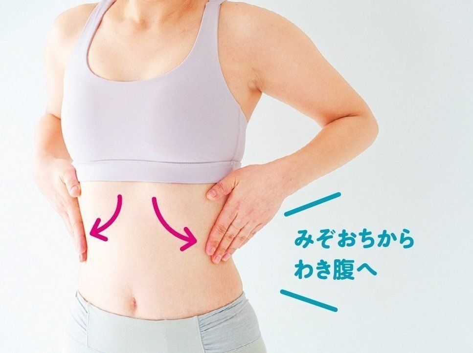 へそからわき腹→わき腹からわきの下へ向かって手のひらで5回さする。さらに、へそから脚のつけ根へ向かって手のひらで5回さする。