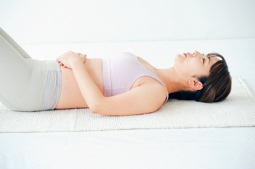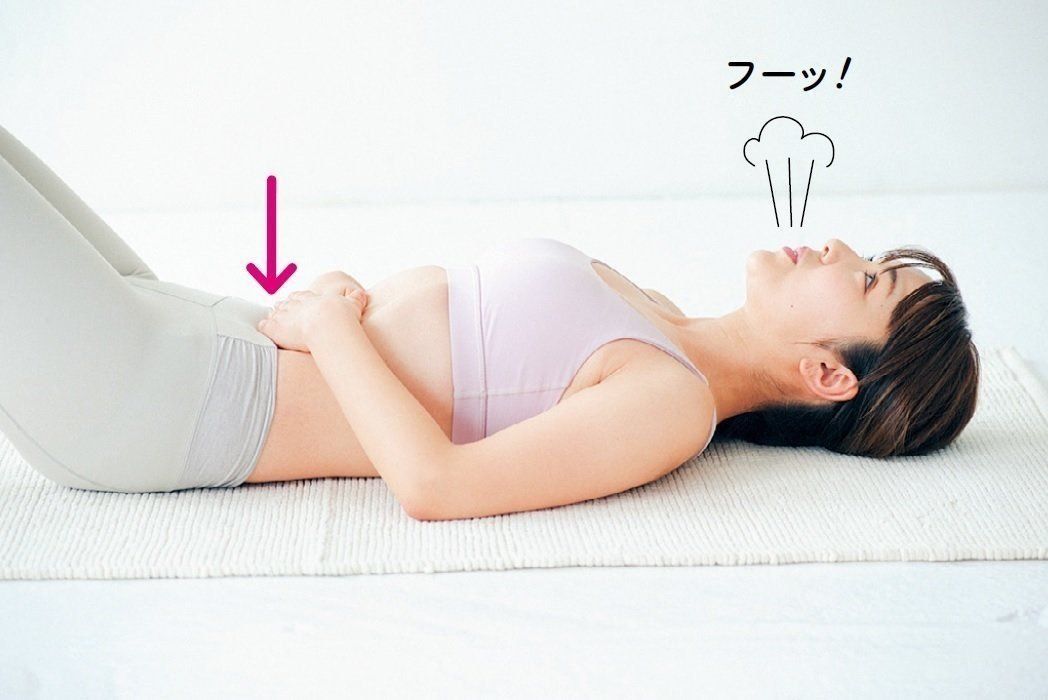 あおむけに寝てひざを立て、へその上に両手を重ねる。息を吸ってお腹をふくらませ、3秒間息を止めながら、両手でへそに圧をかけるように軽く押す。