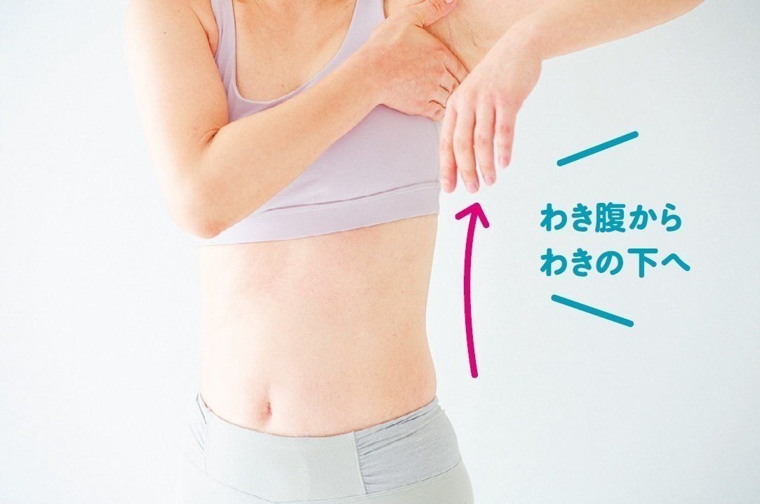 お腹の気になる腹肉!肋骨の奥にある横隔膜、下腹の腸まわりにあるリンパをマッサージで刺激することで代謝が上がり、お腹に停滞している脂肪が落ちやすくなります。朝起きたときの習慣にすると、便秘解消にも◎。