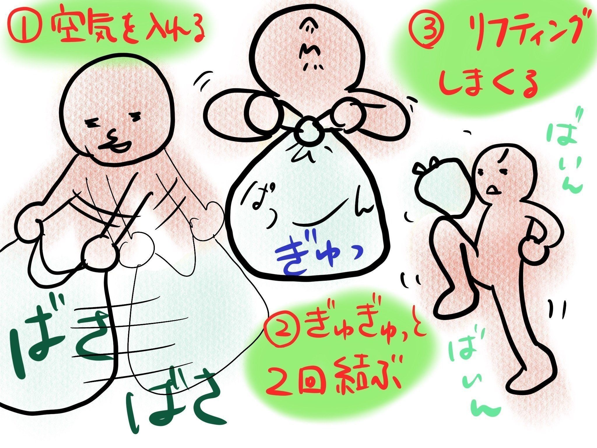 0円だった頃のスーパーのビニール袋を出しまして、空気を入れて2回口を縛ります。風船のできあがりです。これを落とさないようにリフティング。元々は好きなマンガで読んだダイエットネタなのですが、楽しくて運動になるのでオススメです。子どもも楽しんで参加してくれますよ!
