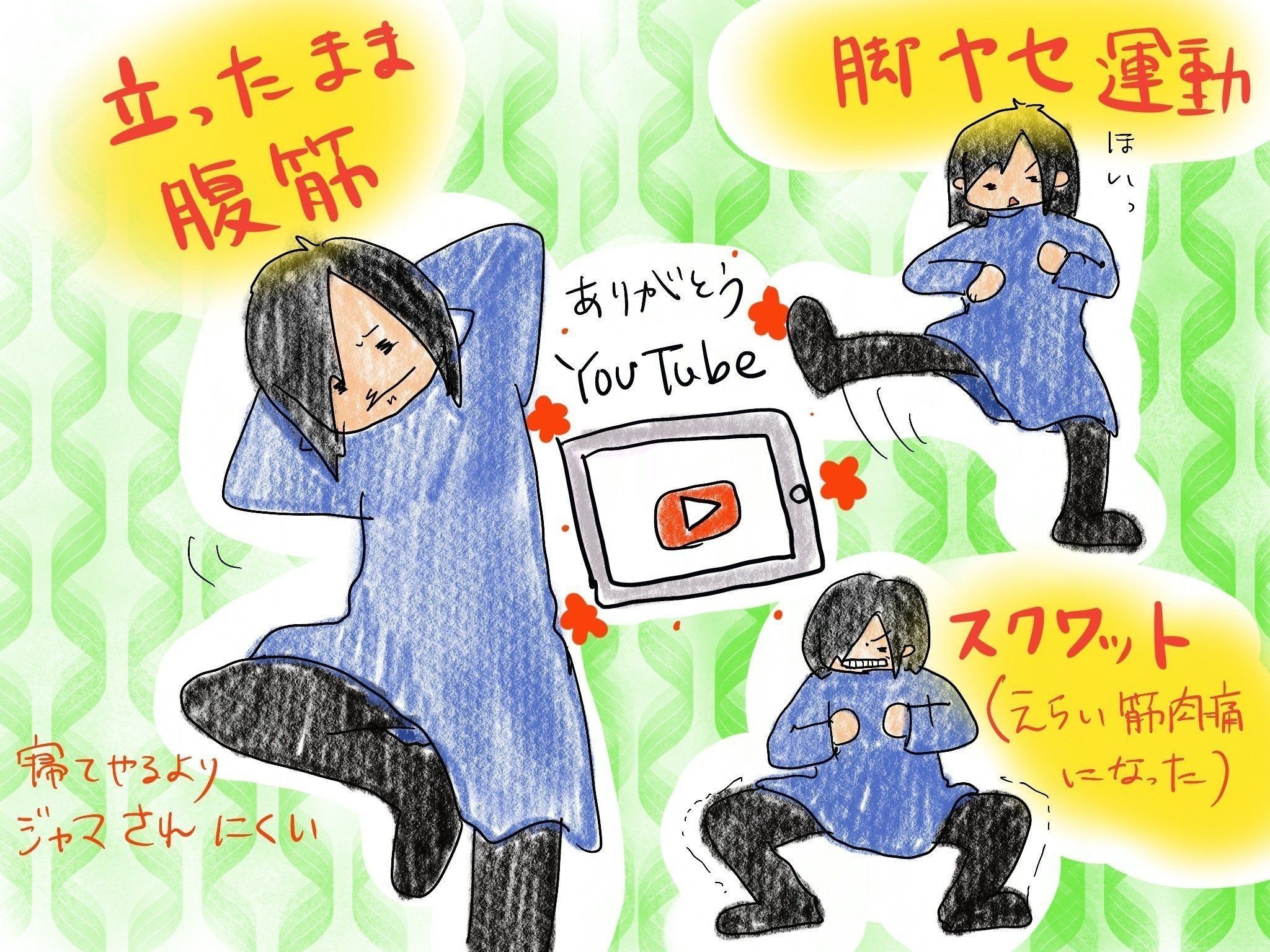 この辺りは好みなので、トークがうまい人にテンションを上げてもらいながらがんばりたいからこの動画、このかたの素敵なスタイルを目標にしたいからこの動画というふうに、好みのものが見つかると続きやすいと思います。あと、簡単すぎずしんどすぎないものがよいです。私は初日に無理をしたらその後2日間しゃがめなくなりました。