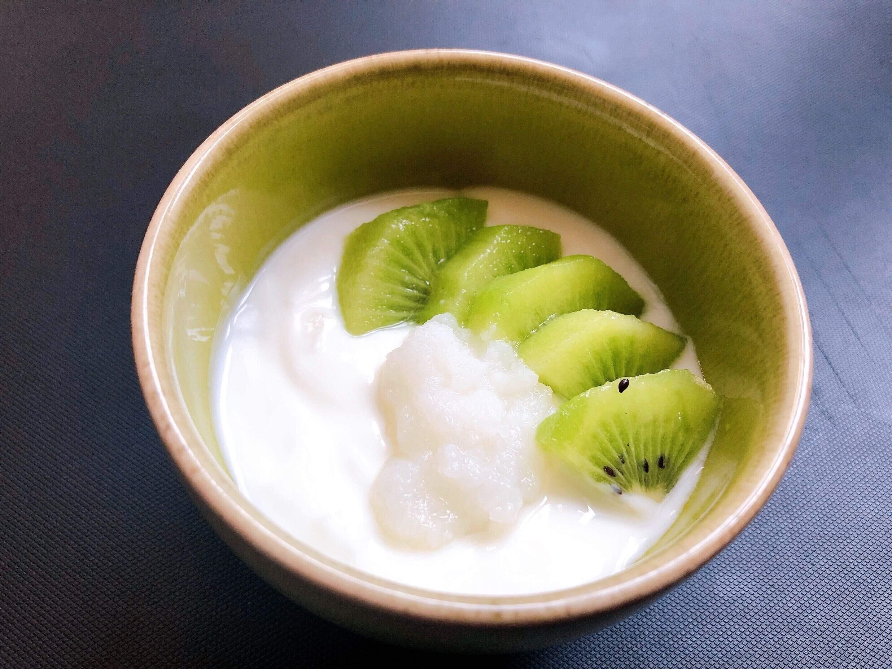 I東挑戦してみたのは、大根おろしヨーグルトにキウイを添えてみました。はちみつとキウイの甘酸っぱさで大根おろしの味はまったく気にならず。むしろヨーグルトに食感が加わて◎でした。