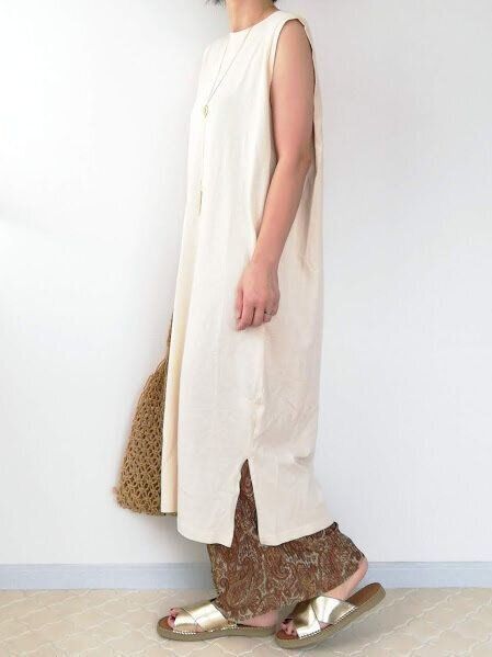 ロングワンピース×柄ワイドパンツのレイヤードスタイル。