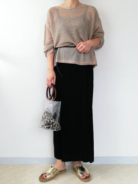 旬なメッシュニット×ロングスカートの大人トレンドコーデ。