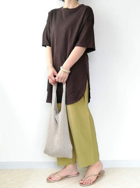 チュニック丈Tシャツでリラックススタイル。あえてインしないゆるコーデで、抜け感ある印象に。きれい色のカラーパンツなら、おしゃれ度がぐっと上がります!
