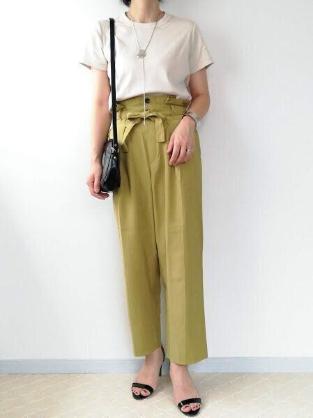 40代が着るなら、Vネックで鎖骨を見せるコーデがおすすめ。明るめな色のカラーパンツを大人らしく見せてくれます。イエロー系となじみが良い、ベージュやブラウン・ゴールドとのコーディネートでまとまりよく。