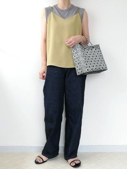 ノースリーブにキャミソールをレイヤード。首がつまったノースリーブを選ぶと、今っぽいカジュアルコーデに仕上がります。