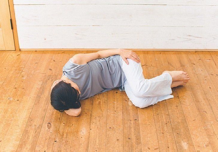背中を丸めて寝ころがると、お腹の筋肉を意識しやすくなり、へこませやすくなります。おへそを中心に、お腹全体を大きくえぐるようにへこませ、〝へこんだ状態〞を筋肉に覚えさせることから始めて。